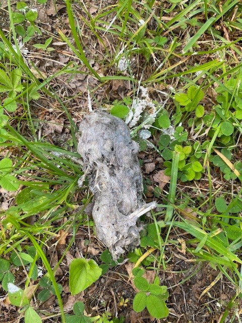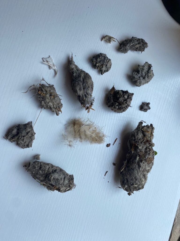 A few weeks later while walking the front of the property, I came upon several feathers and I honed in on a tree that appeared to be a nesting area due to some downy feathers around the base. Upon further inspection, I found several owl pellets! This indeed must be a nest where babies are residing!